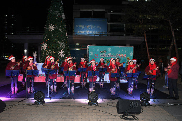 경기 오산시는 크리스마스를 앞두고 지난 4일 시청 광장에서 시청 직원과 지역주민 등의 관계자들이 참석한 가운데 ‘크리스마스트리 점등행사’를 개최했다. 사진은 행사에 찬조 출연한 우쿨렐레 공연단이 악기를 연주하고 있는 모습. (사진제공=오산시청)