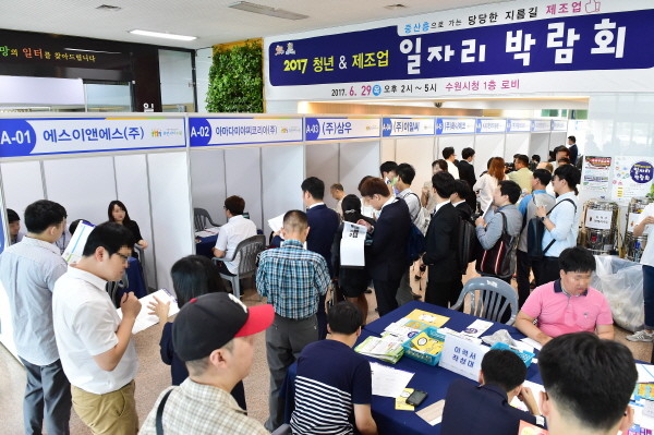 | ▲ 지난 9월 수원시청 로비에서 열린 '2017 청년&제조업 일자리 박람회'를 방문한 관람객들이 행사장을 둘러보고 있다. | ||