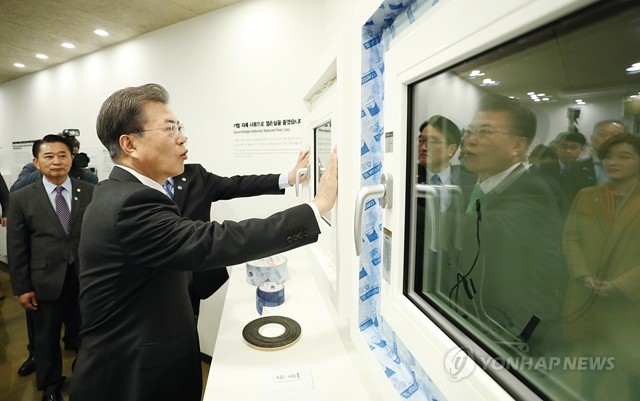 문재인 대통령이 7일 오전 서울 노원구 에너지 제로주택(EZ house) 오픈하우스 행사중 홍보관을 찾아 단열창 등 건축자재를 살펴보고 있다. 에너지 제로 주택은 태양광이나 지열시스템 등 신재생 에너지를 이용해 에너지 비용을 최소화할 수 있는 주택으로, 단열과 기밀 등에 패시브(Passive) 설계 기술을 적용해 적은 에너지로도 쾌적한 생활환경을 유지할 수 있는 장점이 있다.