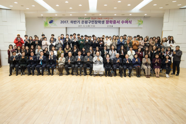 재단법인 은평구민장학재단은 최근 은평구청 은평홀에서 120여 명의 학생과 학부모, 재단 임원들이 참석한 가운데 '2017. 하반기 은평구민장학생 장학증서 수여식'을 진행했다. 사진은 재단임원과 참석한 내빈이 장학생들과 기념촬영을 하는 모습.(사진제공=은평구청)
