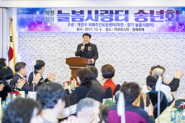 인천 계양구보건소 치매관리사업 위탁기관인 작전, 장기 늘봄사랑터에서 지난 6일 연합송년행사를 실시했다. 사진은 행사에 참석한 박형우 계양구청장이 인사말을 하는 모습.(사진제공=계양구청)