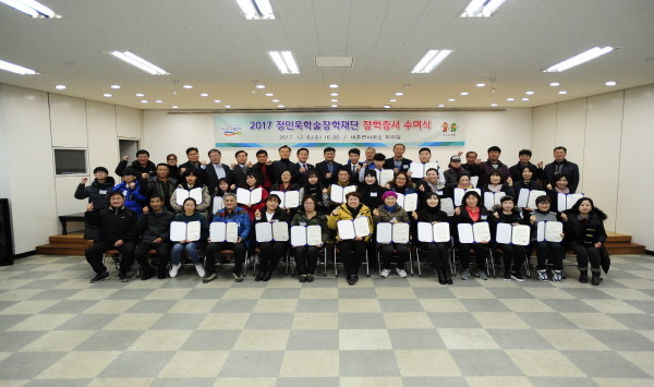 재단법인 정인욱학술장학재단이 지난 6일 경기 포천시 내촌면을 방문해 각 리에서 추천된 성적우수 및 저소득층 학생에게 장학증서를 수여했다. 사진은 장학증서를 받은 학생들을 비롯해 재단 및 면사무소 관계자 등이 기념촬영을 하는 모습.(사진제공=포천시청)