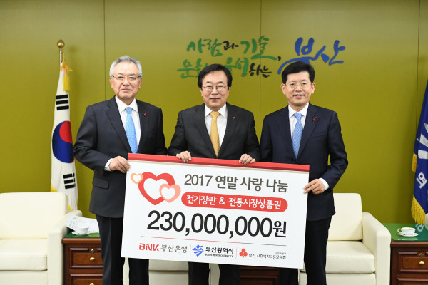 향후 BNK부산은행은 지원 받은 2억3000만원을 상당의 성·금품을 부산지역 각 구·군별로 전기장판(1900가구·9000만원 상당)과 전통시장 상품권(2800가구·1억4000만원·가구당 5만원)으로 전달할 예정이다.