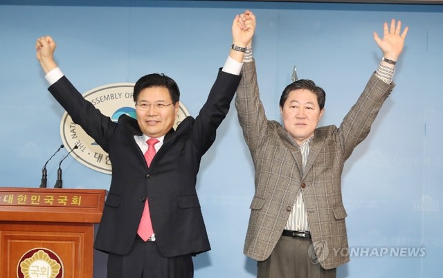 자유한국당 원내대표 경선에 출마한 홍문종(왼쪽)·유기준 의원이 10일 국회 정론관에서 홍문종 의원으로 후보 단일화 한다는 기자회견을 마친 뒤 손을 들어 보이고 있다.
