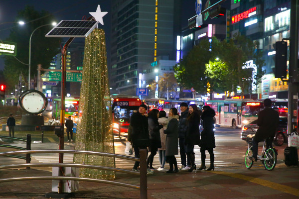 최근 서울 서초구가 크리스마스를 앞두고 횡단보도와 교통섬 등 120곳에 설치된 ‘서리풀원두막’ 중 105개를 시민들에게 ‘서리풀트리’로 단장해 선보였다. 사진은 길에 설치된 ‘서리풀트리’를 구경하고 잇는 시민들의 모습. (사진제공=서초구청)
