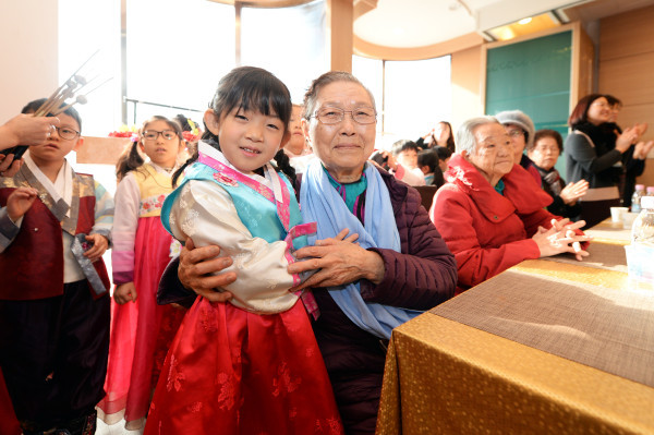 최근 동대문구 웨딩헤너스 연회장에서 고령과 경제적 어려움으로 소외된 홀몸노인 약 140명을 대상으로 ‘어린이와 함께하는 어르신 보듬송년회’를 개최했다. 사진은 한 노인이 행사에 참가한 어린이와 즐거운 표정으로 기념촬영을 하고있는 모습. (사진제공=동대문구청)