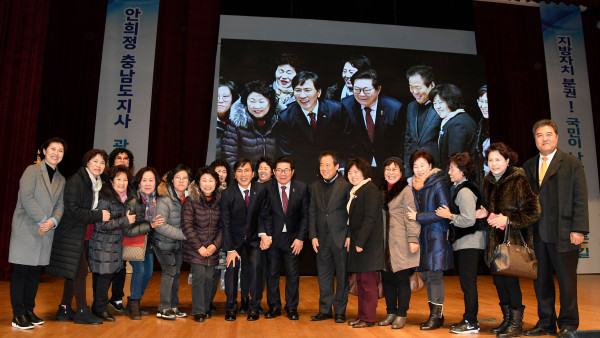 지난 8일 건국대학교 새천년관에서 안희정 충남도지사가 ‘지방자치, 국민이 나라의 주인이 되는 길’을 주제로 강연을 마치고 김기동 구청장 및 광진구민과 기념촬영을 하고 있다. 이번 강연은 광진구가 지방자치공감 확산을 위한 특강으로 안 지사를 초청해 구민 800여명이 참여한 가운데 진행됐다. (사진제공=광진구청)