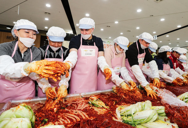 지난 9일 사회복지법인 한국지엠한마음재단이 한국지엠 인천 부평 본사에서 ‘사랑의 김장김치 나눔’ 행사를 실시한 후 이날 담근 총 12톤의 김장김치를 수도권 지역에 위치한 사회복지시설 60곳에 전달했다. 사진은 김장을 하고 있는 봉사자들의 모습. (사진제공=한국지엠)