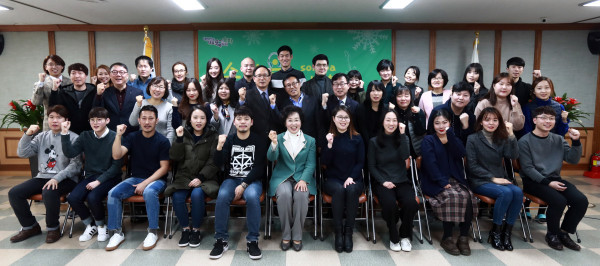 송파구가 11일 구청 대회의실에서 ‘송파 유스 정책 공감 콘서트’를 개최했다. 사진은 콘서트가 끝난 후 박춘희 구청장(가운데)이 참여자들과 기념촬영을 하는 모습.(사진제공=송파구청)