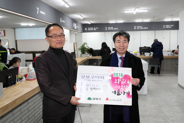 박문수 서울 강북구의장(오른쪽)은 연말을 앞두고 강북구립장애인보호작업장과 지역내 동주민센터 6곳에 성금을 전달하고 이웃사랑 실천에 많은 주민들이 동참해줄 것을 당부했다.