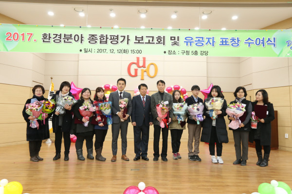12일 서울 구로구가 구청 강당에서 환경단체 회원, 환경분야 유공자 등 200명이 참여하는 ‘2017년 환경분야 종합평가 보고회’를 열고 유공자에 대한 표창식을 진행했다. 사진은 이성 구청장과 표창 수여자들이 행사 후 기념촬영을 하고 있는 모습. (사진제공=구로구청)