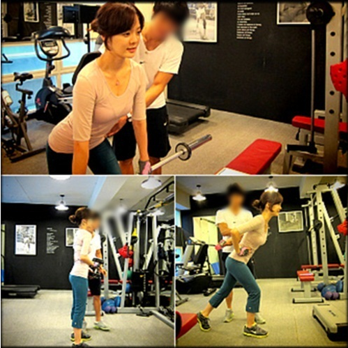 글에는 헬스장에서 트레이너와 함께 운동하고 있는 채림 모습이 담겨 있다.