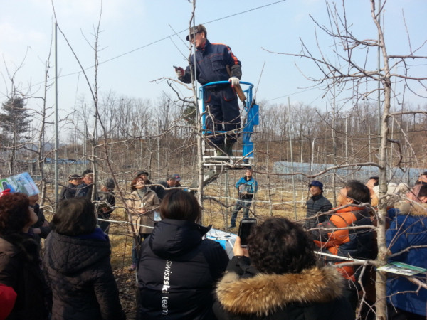 경기 연천군은 12~13일 양일에 걸쳐 지역내 친환경 사과농가 농민 30여명이 참석한 가운데 지난 11월 개관한 농업기술센터 서부지소에서 과원관리교육을 실시했다. 사진은 친환경컨설턴트 강사가 재배관리 및 병충해 방제방법에 대해 설명하는 모습. (사진제공=연천군청)