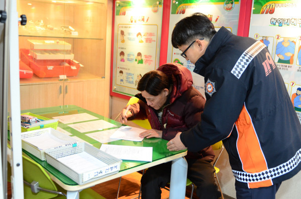 서울 영등포소방서는 12일 오후 소방서 소회의실에서 ‘다중이용업소 관계인 소방안전교육’을 실시했다. 사진은 소방서 관계자가 교육에 참여한 다중이용업소 관계자의 교육신청서 작성을 돕고 있는 모습. (사진제공=영등포소방서)