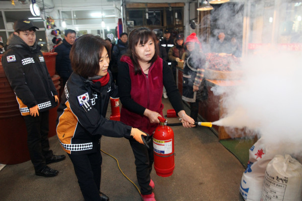 은평소방서는 오는 22일까지 시장 상인들의 생활터전과 이용시민들의 화재안전을 강화하기 위해 겨울철 ‘안전한 전통시장 만들기’ 클린 서비스를 추진한다. 사진은 13일 대림시장에서 참여자들이 소화기 사용 실습을 하는 모습. (사진제공=은평소방서)