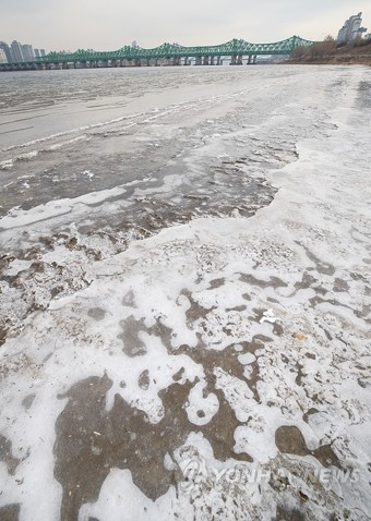 서울 최저기온 영하 9도를 기록한 14일 서울 여의도 한강공원 인근이 얼어있다.