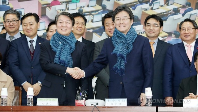 국민의당 안철수 대표와 바른정당 유승민 대표가 14일 오후 부산시의회에서 열린 국민통합포럼 세미나 '청춘의 미래를 위한 부산'에 참석해 국민의당 경남도당 전 여성위원장이 준비한 목도리를 하고 악수를 하고 있다.