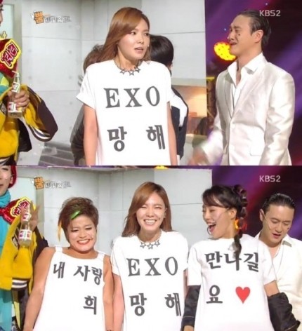 지난 2013년 KBS '개그콘서트'의 코너 '뿜엔터테인먼트'에 출연한 신보라는 '엑소 망해'라는 티셔츠를 입고 나와 눈길을 끌었다.