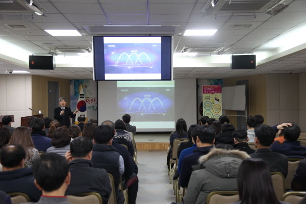 경기 수원시 팔달구에서는 지난 13일 소속 직원을 대상으로 공직자 미래설계교육을 실시했다. 사진은 김형진 국제사이버대학교 교수가 '우리의 미래, 어떻게 준비할 것인가?'라는 주제로 강의를 진행 중인 모습.(사진제공=팔달구청)