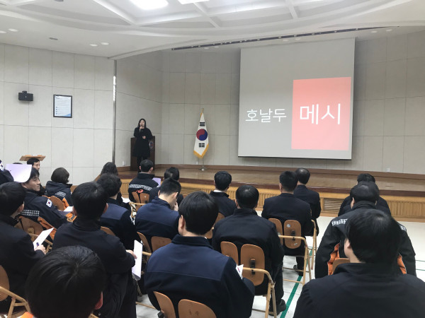 서울 동작소방서는 최근 소방서 3층 강당에서 심리상담센터 'Mindco' 디렉터 이지연 강사 초빙, 외상사건에 대한 적응력 강화 및 정신건강 증진을 위한 교육을 실시했다. 사진은 자가진단을 통한 탈출비법 소개 등에 대한 강의가 진행 중인 모습. (사진제공=동작소방서)