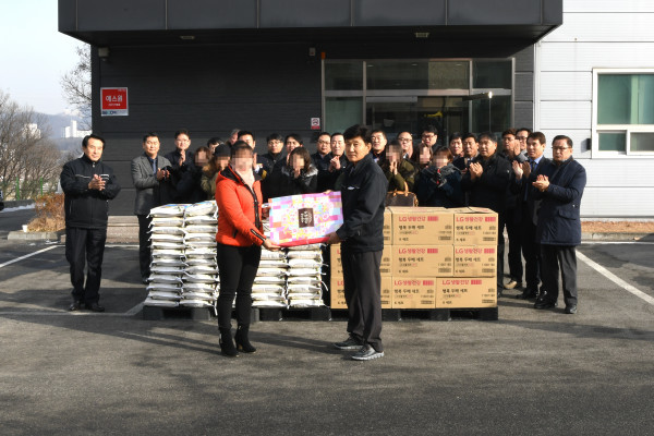 경기 이천경찰서와 신둔면 소재 ㈜일진콤텍&일진전자는 이천지역 북한이탈주민들에게 쌀(10kg)과 생활용품세트 등 생필품을 ‘사랑의 선물’로 전달했다. 사진은 전달식에 참여한 북한이탈주민과 경찰서, 회사 관계자들이 기념촬영을 하는 모습. (사진제공=이천경찰서)