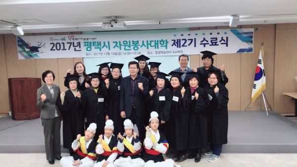 최근 경기 평택시자원봉사센터가 평생학습센터 B교육장에서 수료생 70여명과 함께 ‘제2기 평택시자원봉사대학 수료식’을 진행하고 수료증을 수여했다. 사진은 수료식 후 기념촬영하는 교육생들의 모습. (사진제공=평택시청)