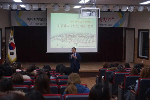 충남 아산교육지원청은 19일 초등예비학부모 200명을 대상으로 '2018 초등예비학부모교육'을 실시했다. 사진은 탕정미래초등학교 신세균 교장이 '예비학부모와 함께 초등학교 1학년 행복 찾기'라는 주제로 강의하는 모습. (사진제공=아산교육지원청)
