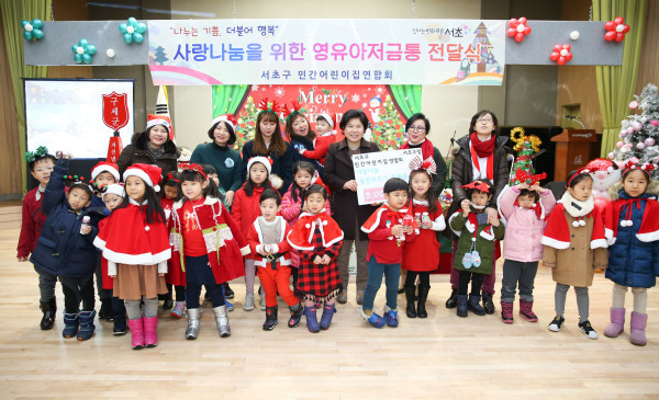 지난 18일 서울 서초구청 대강당에서 민간어린이집 재원 아이들이 올 한 해동안 고사리 손길로 모은 저금통 모금액 900만원을 기부하는‘이웃돕기 희망의 저금통’ 전달식이 개최됐다. 사진은 전달식에 참석한 아이들과 관계자들이 기념촬영을 하고 있는 모습. (사진제공=서초구청)