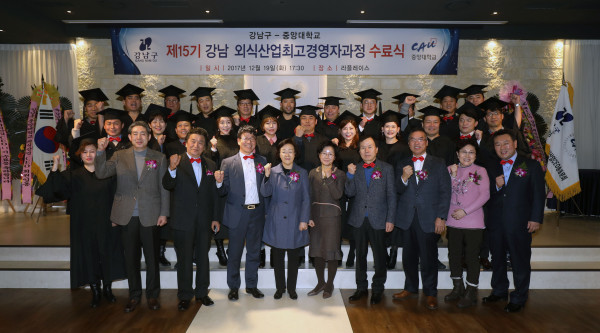 19일 서울 강남구 대치동 라플레이스에서 평생학습 활성화를 위해 실시된 ‘제15기 강남외식산업최고경영자과정’ 교육프로그램 수료식이 개최됐다. 사진은 수료식에 참석한 수료생·원우들이 기념촬영을 하고 있는 모습. (사진제공=강남구청)