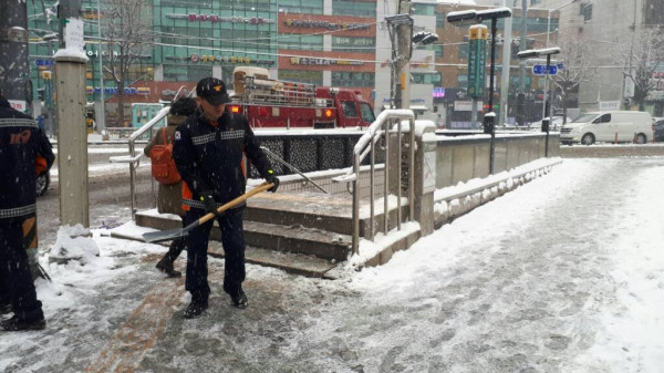 서울 동작소방서는 지난 18일 오전 9시10분 기상청 대설 특보가 발효됨에 따라 제설지원 대책 추진에 나섰다. 사진은 소방서 관계자가 신대방삼거리역에서 눈을 치우고 있는 모습. (사진제공=동작소방서)