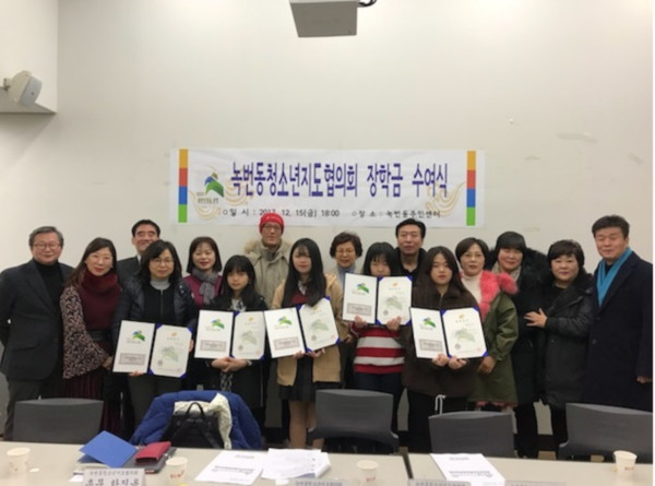 '녹번동청소년지도협의회'가 최근 서울 은평구 녹번동 주민센터에서 '사랑의 장학금 전달식'을 열었다. 협의회는 회원들이 추천한 7명의 학생에게 총 140만원의 장학증서를 전달했다. 사진은 협의회 회원들과 장학금 수혜 학생들이 기념촬영을 하는 모습. (사진제공=은평구청)