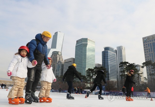 서울 여의도공원 스케이트장 '여의아이스파크'가 개장한 20일 오후 쌍둥이 자매가 아빠의 손을 잡고 스케이트를 타고 있다. 내년 2월 말까지 운영되는 여의아이스파크의 이용 요금은 90분 단위로 입장료 1천원이고, 일일권은 2천원이다.