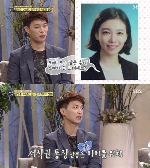 김원준은 “어느 날 아내가 갑자기 ‘모두 잠든 후에’ 오빠가 쓴 노래냐고 물었다. 자작곡 쓰는 사람들은 저작권 통장이 따로 있다면서? 라고 묻더라”며 아내가 저작권료 통장을 노린다고 밝혔다.