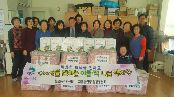 경기 평택시 자유총연맹 원평동분회에서는 지난 20일 지역내 어려운 이웃을 위해 원평동 주민센터에서 이불 및 흰 떡 나눔 봉사활동을 펼쳤다. 사진은 참여자들이 기념촬영을 하는 모습. (사진제공=평택시청)