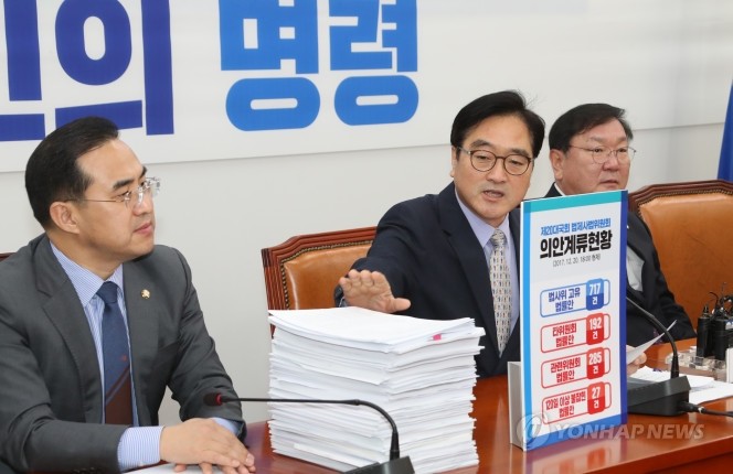 더불어민주당 우원식 원내대표가 21일 국회에서 열린 정책조정회의에서 “민생개혁 발목잡기 수단으로 변질한 법사위의 체계 자구심사 개혁을 위한 국회법 개정안을 곧 발의하겠다”고 발언하고 있다. 그는 특히 “이번 임시국회 들어 (어제) 첫 법사위 전체회의가 열렸지만 전체 900여건 가운데 고작 31건만 처리됐다”며 “국정 수행에 바쁜 국무위원을 모조리 출석시키고 대국민 의혹 부풀리기 하는 정치공세로 금쪽같은 시간을 낭비했다”고 목소리를 높였다.
