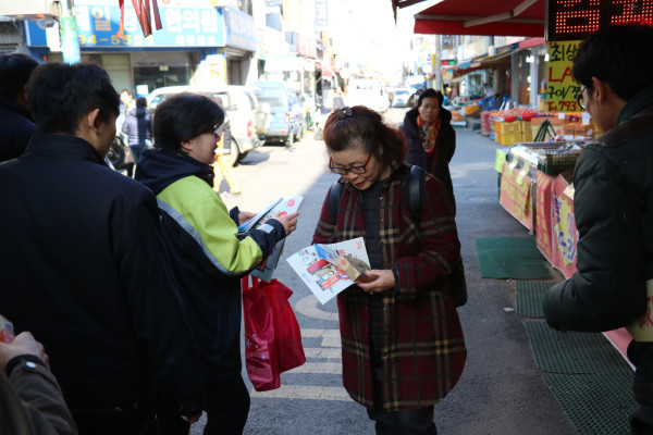 경기 하남소방서는 22일 신장전통시장 일대에서 소방공무원, 의용소방대 등 40여명이 참여한 가운데 겨울철 화재예방 캠페인을 실시했다. 사진은 소방서 관계자가 시민에게 전통시장 화재예방 매뉴얼을 배부하는 모습.