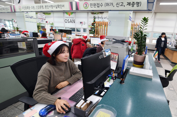 경기 오산시가 오는 26일까지 크리스마스 맞이해 시청 민원실 민원창구 직원들이 산타모자를 쓰고 민원인을 응대하는 ‘산타 민원 서비스’를 실시한다. 사진은 민원 창구에서 산타복장을 한 관계자가 업무를 하고 있는 모습.(사진제공=오산시청)
