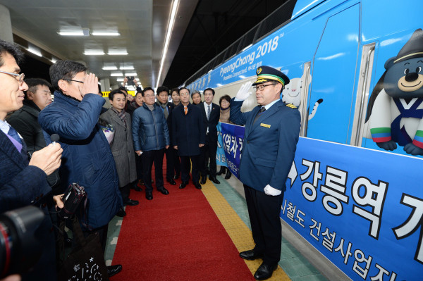 22일 오전 서울 동대문구 청량리역에서 KTX 경강선 개통행사가 열렸다. 경강선 KTX 개통으로 청량리에서 강릉까지 86분, 평창까지 63분이 소요된다. 사진은 개통행사에서 최초기관사가 출무신고를 하는 모습.(사진제공=동대문구청)