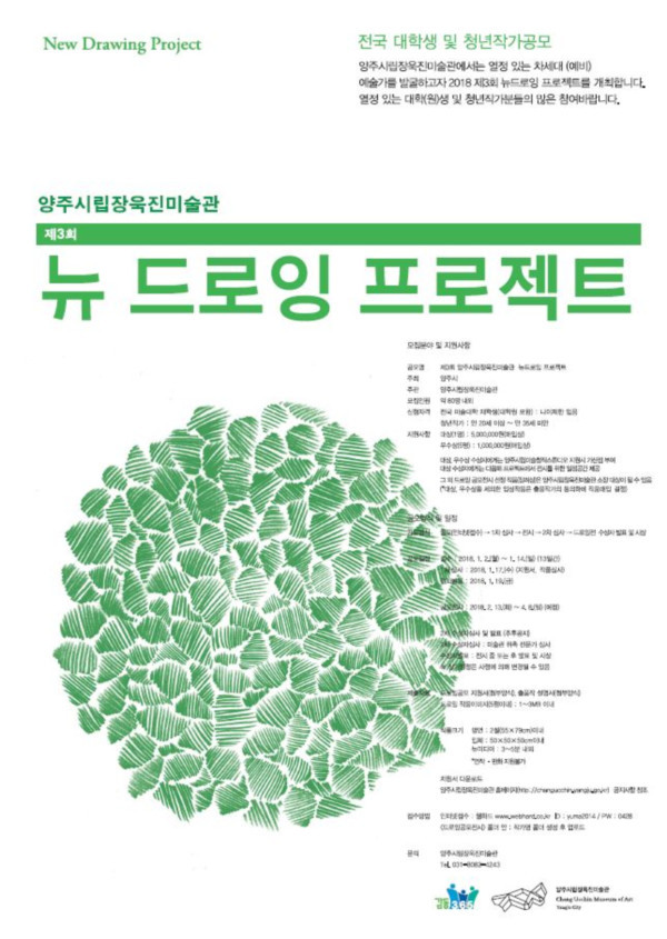 공모접수는 오는 2018년 1월2~14일 양주시립장욱진미술관 홈페이지에서 지원서를 내려 받아 작품 등과 함께 접수하면 되고 1차 심사결과는 2018년 1월17일 발표할 예정이다.