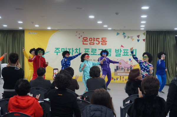 [아산=박명수 기자]충남 아산시 온양5동 주민센터와 주민자치위원회가 최그 주민자치센터 별관에서‘2017 주민자치센터 프로그램 발표회’를 성황리에 마쳤다. 사진은 참여자들이 에어로빅 공연을 선보이는 모습.(사진제공=아산시청)