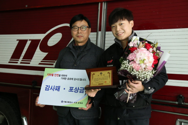 서울교통공사는 강남소방서 영동119안전센터 구급대원으로 근무하는 김지웅 소방사를 지하철 의인으로 선정, 최근 근무지를 방문해 감사패를 수여했다. 김 소방사는 지난 11월8일 남태령역에서 심정지 환자에게 심폐소생술을 시행, 소중한 생명을 살린 바 있다. 사진은 교통공사 관계자와 김 소방사가 기념촬영을 하는 모습. (사진제공=강남소방서)