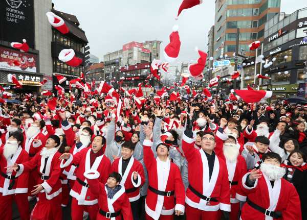 지난 24일 신촌 연세로에서 열린 크리스마스 거리축제에서 '몰래산타 대작전' 출정식에서 산타 복장을 한 참가자들이 함께 모여 모자를 하늘로 던지고 있다.