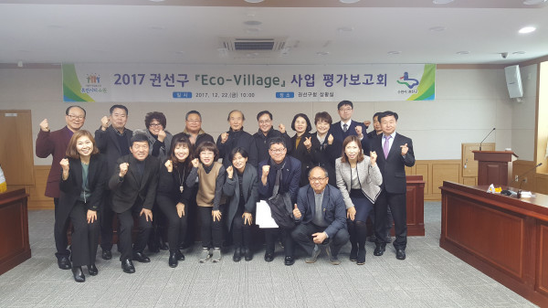 수원시 권선구는 최근 각 분야 전문가와 센트라우스아파트 입주민 30여명이 참석한 가운데 ‘2017년 Eco-Village(에코빌리지) 사업 평가보고회’를 개최했다. 이번 보고회는 사업의 추진결과를 전문가와 아파트 입주민이 함께 평가해 자발적 친환경 생활 실천마을로서 발전 방안을 강구하기 위해 마련됐다. 사진은 참여자들이 기념촬영을 하는 모습. (사진제공=권선구청)