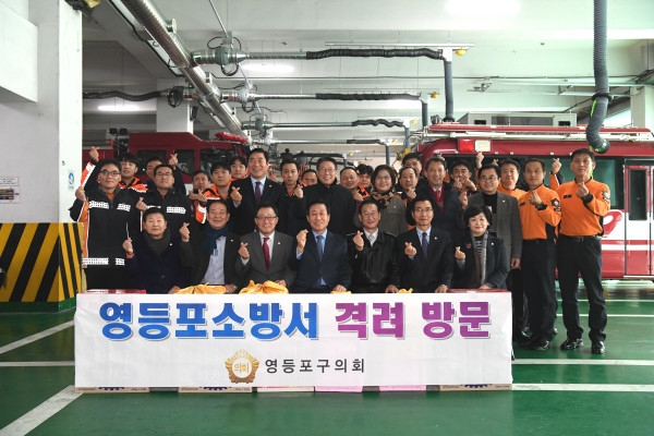 최근 서울 영등포구의회는 영등포소방서를 방문, 강추위 속에서 구민안전을 위해 화마와 싸우는 소방대원들의 노고를 격려하고, 위문품을 전달했다. 사진은 소방서를 방문한 구의원을 비롯한 소방대원 등이 기념촬영을 하는 모습. (사진제공=영등포구의회)