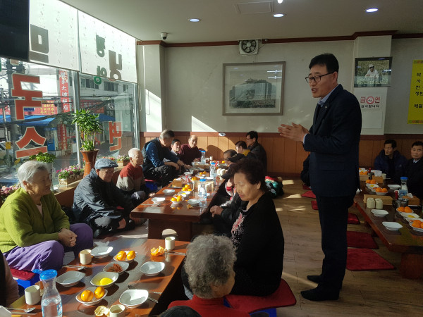 경기 수원시 팔달구 고등동에서는 26일 연말을 맞아 주민자치위원회 주관으로 홀몸노인 60여명을 초대해 외로움과 한파로 고생하는 노인들에게 떡만둣국을 대접했다. 사진은 동 관계자가 노인들에게 인사말을 하는 모습. (사진제공=팔달구청)