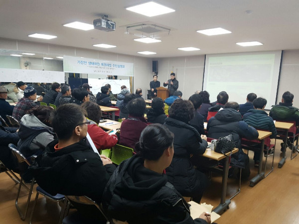 경기 오산시는 최근 초평동 주민센터 다목적실에서 '가장천 생태하천복원사업' 주민설명회를 개최했다. 이번 설명회에는 동 주민 50여명이 참석했다. 사진은 설명회에 참석한 주민들이 시청 관계자의 설명을 경청하는 모습. (사진제공=오산시청)