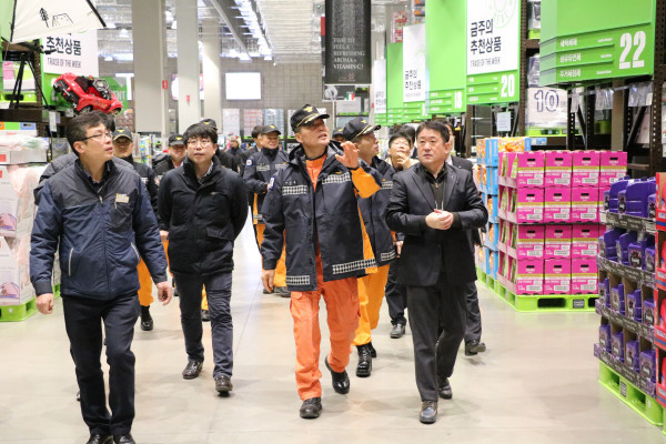 경기 군포소방서는 28일 대형화재 사고예방을 위한 이마트트레이더스 군포점을 방문해 현장 안전컨설팅을 실시했다. 사진은 관계자들이 시설을 점검하고 있는 모습. (사진제공=군포소방서)