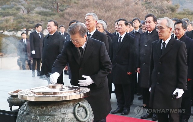 문재인 대통령이 이낙연 국무총리와 국무위원, 청와대 수석비서관 등과 2일 오전 서울 동작동 국립서울현충원을 찾아 현충탑에 헌화한 뒤 분향하고 있다.