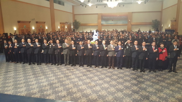 [목포=황승순 기자] 목포상공회의소가 무술년 새해를 맞아 지난 2일 오후2시 호텔현대목포 컨벤션홀에서 400여명의 서남권 기관단체장 및 상공인들이 참석 ‘2018 신년인사회’를 갖고 서남권 발전을 위한 다짐과 덕담을 나눴다. 사진은 참석자들이 국민의례를 하고 있는 모습.