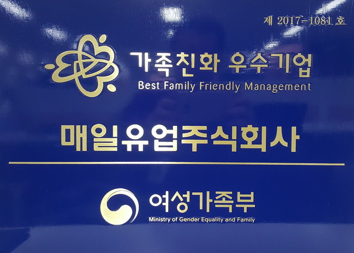| ▲ 매일유업의 가족친화인증기업 인증 현판.(사진제공=매일유업) | ||